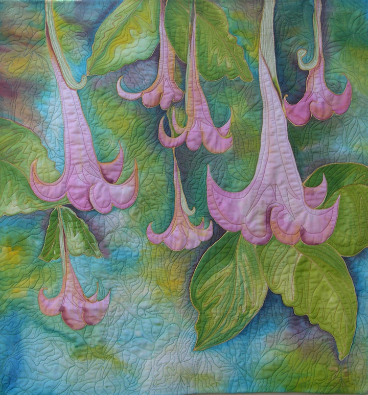 You probably wonder why I’m showing paintings rather than art quilts, but I wanted you to see my progression into fiber. Some of those are destined for printing on fabric for other art quilt projects. Now here are some of my art earlier quilts, all dye painted on fabric. I nominate Jeannie Sredl to show here work next.