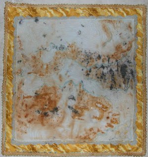I don’t usually frame my work with borders but this seemed to need it. With fabric and some rust dyed vintage trim I created my idea of a fancy gold frame. Sort of a tongue in cheek that this beauty in nature needed to be presented as fine art.