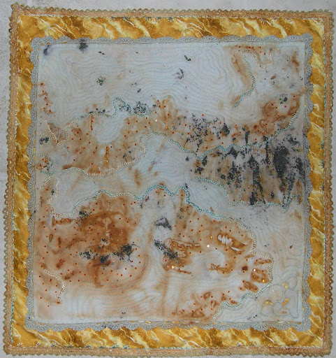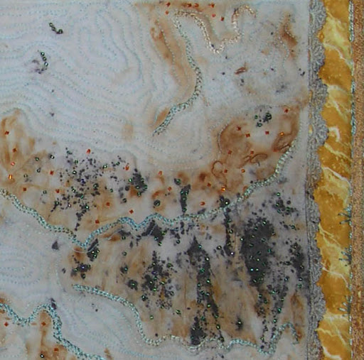 The black areas were the result of experimenting with additions to the rusted fabric. I got some pretty interesting designs, some intentional, some accidental. I started with embroidering areas of rust to separate them and contain them into form. I was careful to keep the eye moving through the piece. next I free motion quilted the least rusted forms.