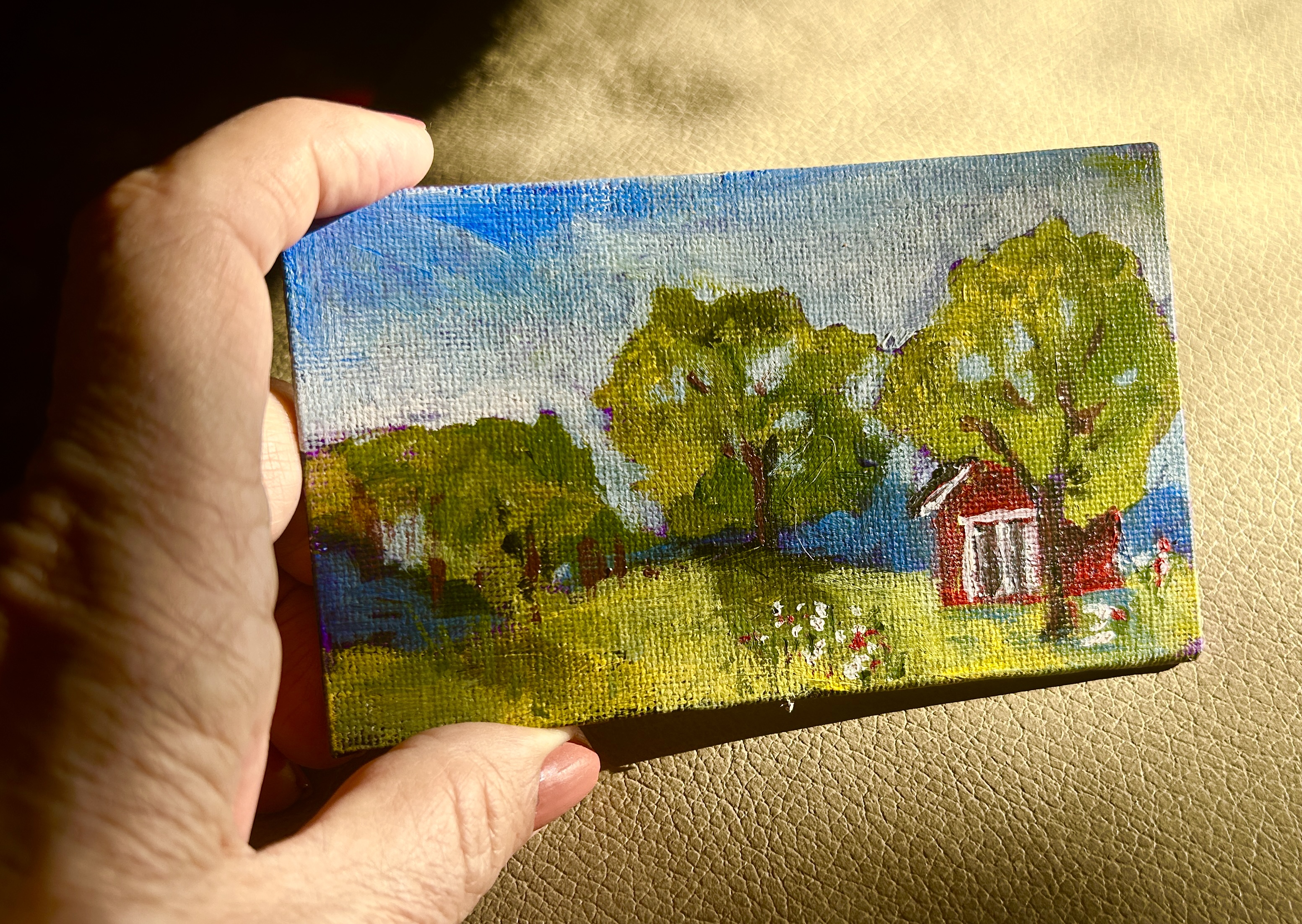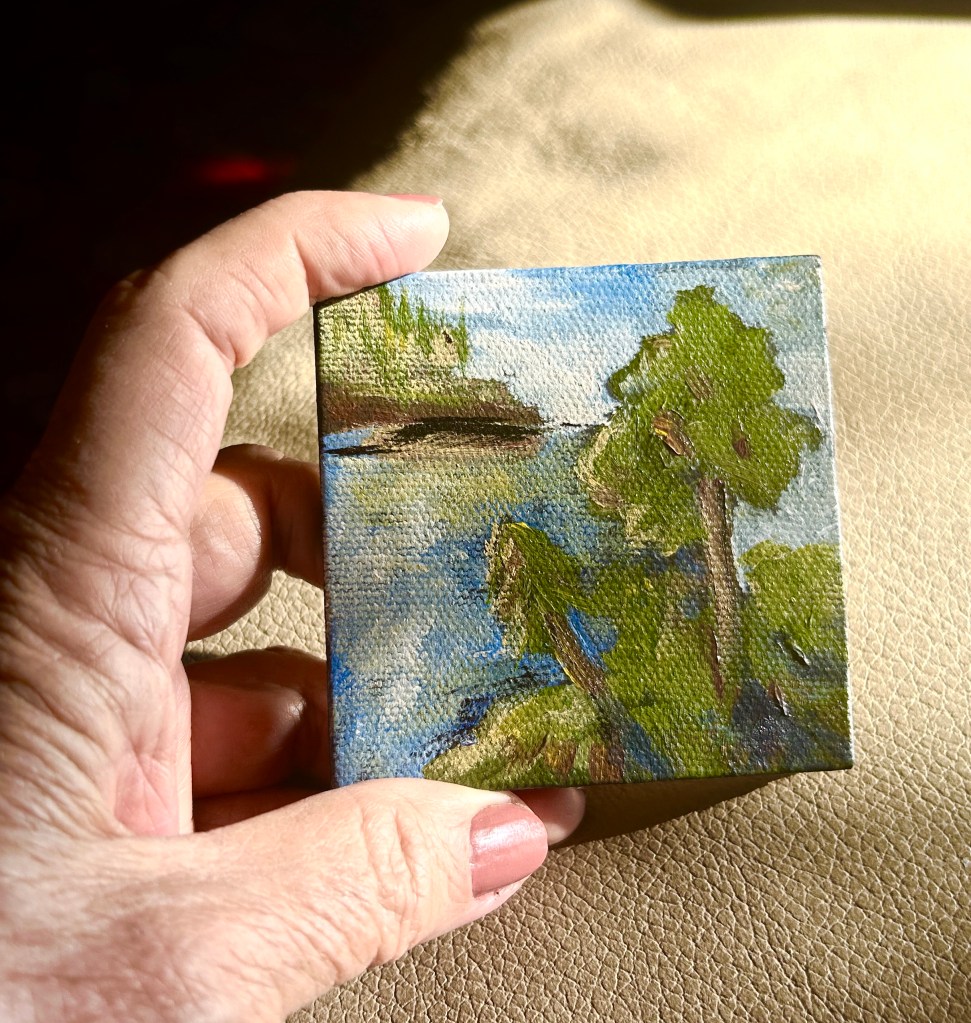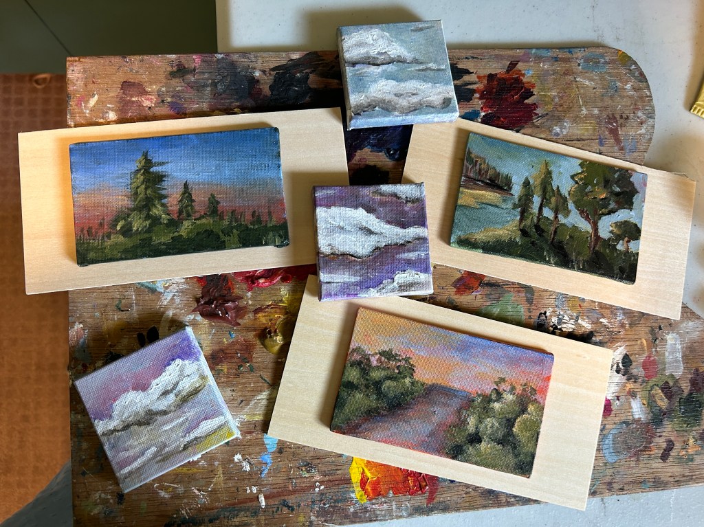 Teeny, tiny minis. They all are painted from photos I took while painting en plein air. I like to have these on hand for purchase anytime I sell in person. They are easy for people to grab for a corner in their home, to liven up their cubicle at work or to slip into a padded envelope to mail to a friend.