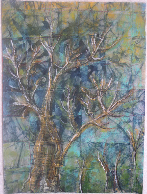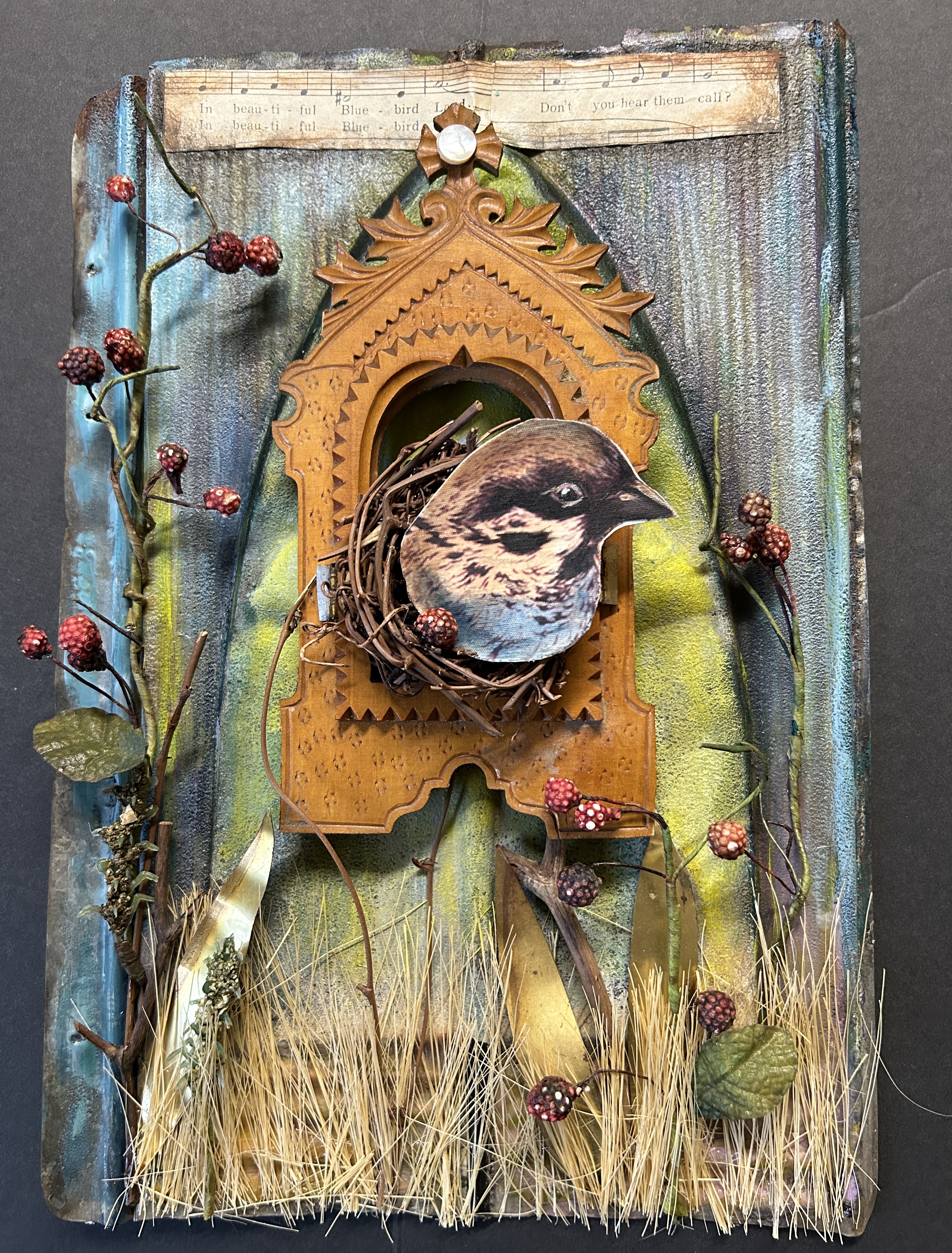 This first one is named Bluebird Land. If you can enlarge the photo of the finished piece you can see the antique music decoupaged at the top. My mother was a singer on WSOY radio when she was young and I have most of her music from that time period. It hasn’t fared well and is pretty ragged and crumbly. I don’t mind using it for projects like this since it gives it new life.