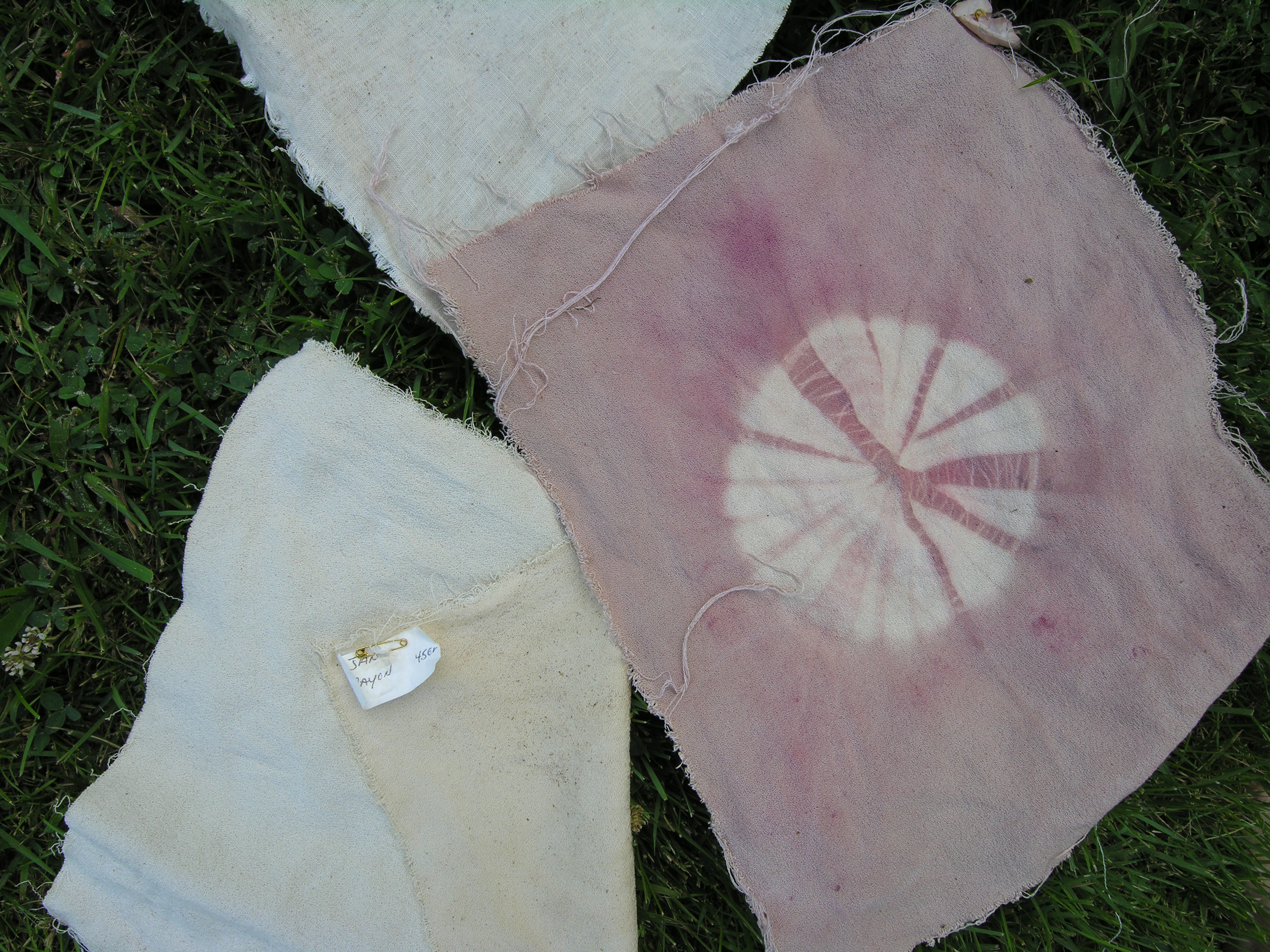 After 3 dips in 3 days, this is the color card for the green persimmon dye. You can see the original fabric was very white. The literature on using persimmons says it makes fabrics water resistant and can be painted onto paper or fiber bowls. It was difficult to make the fabric soak up the persimmon after the first day and you could see the moisture bead on the linen piece. The dupioni silk piece didn’t react and there was very little color change on day 2 so I didn’t bother on day 3. The deepest change was on the rayon piece and I found that same thing using indigo. I’m thinking that rayon is going to be my fabric of choice.
